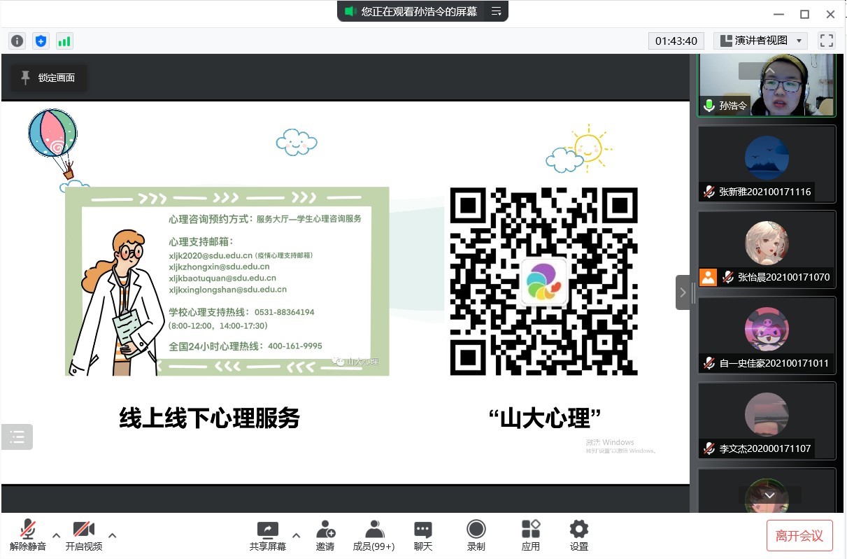 组织开展“走近心灵”讲座,学生心理健康与咨询中心专职教师孙浩令做“疫情下的校园生活,这样提升幸福感”专题讲座,300余名同学线上参加活动。