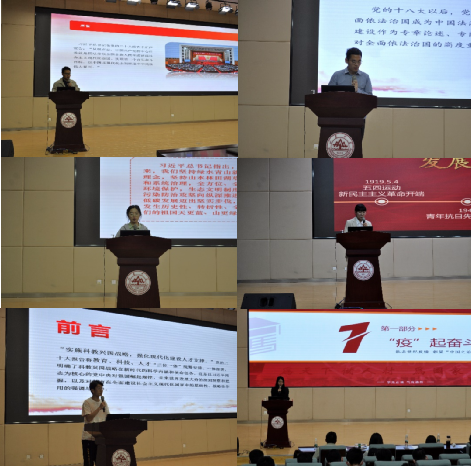 马雁思从中国近代化艰难探索的历史入手,结合习近平总书记“以中国式现代化全面推进中华民族伟大复兴”的重要指示,阐述当今中国进行中国式现代化概念及意义,号召同学发挥青年强国力量,让青春在全面建设社会主义现代化国家的火热实践中绽放绚丽之花。随后,董国欣、付晓宇等五位同学从法治中国建设、科技强国战略、生态文明建设、社会主义建设等方面对党的二十大精神进行宣讲。其中,杨佩云就党的二十大报告中的法治中国建设做出自己的分享,引领同学们学习党的二十大法治思想,号召同学们尊法学法守法用法,弘扬社会主义法治精神,争做普法宣传山大人。苏雯菁从党的二十大报告对青年提出的期望出发,叙述黄文秀、黄旭华、廖自涵等榜样故事,激励同学们勇立时代潮头,培养创新思维,积极响应党的二十大号召,把握机遇,迎接挑战,为谱写新中国时代华章贡献青春力量。六位宣讲人带领同学们学习领会党的二十大报告主要内容,报告内容丰富、视野开阔,用青年易于接受的方式方法对党的二十大精神进行全面系统、深入浅出地解读,带领同学们深刻理解中国式现代化理论和全面建设社会主义现代化国家战略布局的关系。