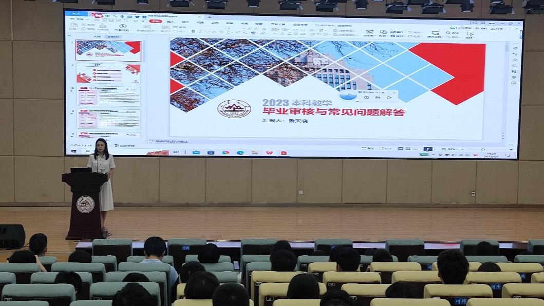 本科生学生学籍管理规定、选课常见问题及本科毕业审核要求,对毕业审核常遇问题进行汇总说明。她强调,同学们要根据毕业要求,做好学分绩点的核对工作,有任何问题及时与教务处沟通。随后同学们进行现场提问,林磊同、鲁天晓就选课、学分转换等问题作出解答。