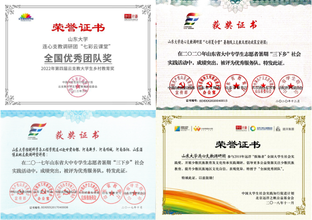 优秀社会实践团队、山东省优秀社会实践团队,获评2019年“榜样100”全国最佳大学生社团,曾获2022年第四届大学生云支教乡村教育奖、阿克苏诺贝尔全国大学生社会公益奖、全国远洋之帆大学生社会实践奖等。