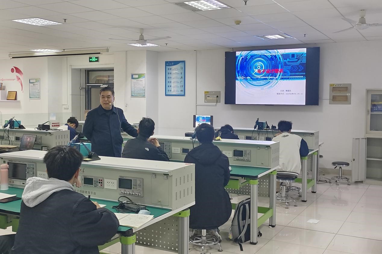 讲座伊始,姚福安为同学们介绍全国大学生电子设计竞赛的基本内容和考题分类,激发起同学们对电子设计竞赛的兴趣和热情。随后,姚福安从元器件选型和基础电子电路入手,讲解常用电子仪器使用、常用电子器件焊接及电子电路设计软件等基础内容;以模拟电子系统为切入点,详细介绍信号的获取及常用非电量转换方法、模拟信号处理及信号变换技术、A/D与D/A转换技术应用等方面的知识。为帮助同学们深入认识电子设计电路组成特点以及信号的处理及传递过程,姚福安向同学们推荐了《运算放大器权威指南》《振荡电路的设计与应用》等参考书目,引导同学们正确认知竞赛目的,构建竞赛知识架构体系。最后,姚福安从结构、用途、数值标注、性能指标、应用等方面讲解了电阻电容的知识,引导学生将专业、学业和创新结合起来,同学们纷纷表示受益匪浅。