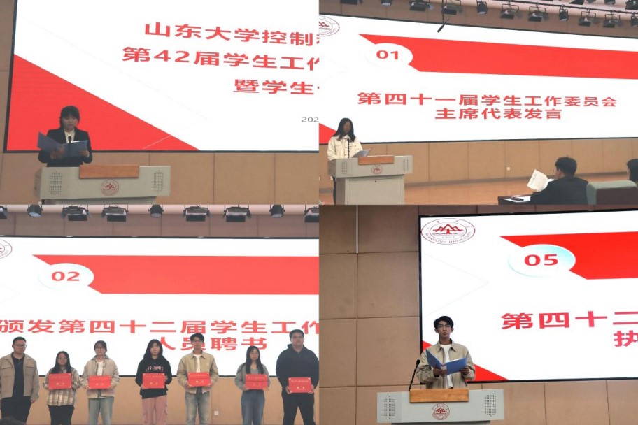 第四十一届学生工作委员会执行主席张新雅回顾了过去一年的工作成果,结合自身工作经历,为新一届学生工作委员会送上亲切寄语。2022级辅导员马雁思为第四十二届学生工作委员会主席团、部长团成员颁发聘书并合影留念。其后,SWAG
