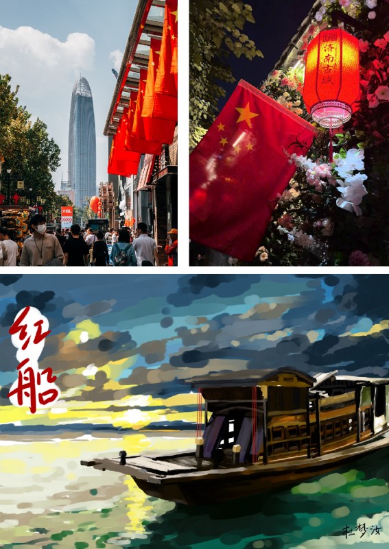 在这些作品中,有人以文字的力量诉说家国情怀,“无论身在何方,那抹红,永远是心底最深的情,指引着我们,共同追梦,永不停息”;有人通过镜头记录了国庆节期间的繁华街头,鲜艳的五星红旗在高耸的现代建筑间随风飘扬,展现出新时代城市的活力与奋进,映衬出祖国走过的辉煌历程与无限未来;还有人用画笔描绘了象征革命起点的红船,它静静漂浮在波光粼粼的湖面上,承载着革命的初心与历史的厚重,晨曦下,江水与天际交融,象征着新时代奋斗的道路不断延展,表达了创作者对红船精神的敬仰,传递出中国人民在新时代继续扬帆远航的信念与力量。经过同学们的投票评选,一批优秀的作品脱颖而出,这些作品不仅展现了同学们的非凡才华和独特视角,更生动地表达了对祖国的深情厚谊和对美好未来的憧憬。