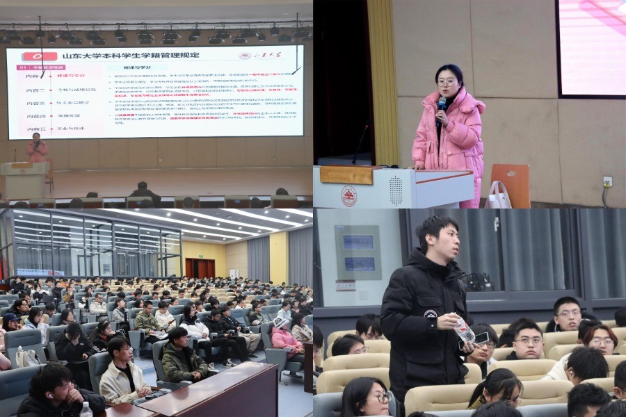 本科学生学籍管理规定》进行深度解读,确保教学工作的规范性和严谨性。她解读了本科人才培养方案的构成体系和指导作用,阐述了关键内容,重点围绕学生选课的常见问题与毕业审核要求等方面展开系统讲解,并指出重要时间节点和事项,特别是毕业生要把握重点,提前规划,加强学术诚信。在选课常见问题阶段,孙亚介绍了选课流程,帮助同学们规避选课误区,轻松、高效地完成选课。针对选课流程中的核心环节作出重点提醒,孙亚强调需严格参照班级课表选择必修课程,提醒学生注意课程代码一致性及重修课程属性修改等细节,防止出现选择同名课程但不同编号导致无法毕业的现象。在毕业审核要求阶段,她特别指出除明确学分、绩点、体测等硬性指标外,“稷下创新”“齐鲁创业”等特色课程以及人文、国学等相关课程也有相应的学分要求。最后孙亚根据毕业审核所遇到的常见问题,例如,毕业时间节点、任选课程学分的补修等内容进行了详细解答。