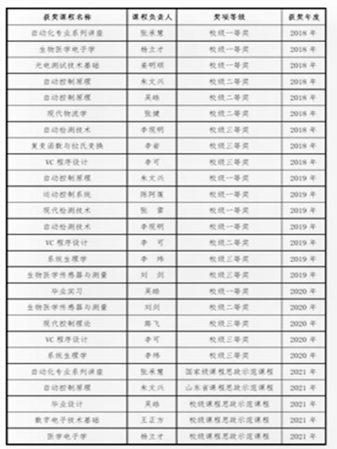 课程思政建设取得新突破,《自动化专业前沿讲座》课程及其授课团队获教育部首批国家级课程思政示范项目课程、教学名师及团队。另外,获山东省本科教育课程思政示范课程1门、SWAG