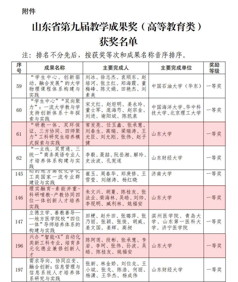 近日,山东省教育厅公布了山东省第九届教学成果奖(高等教育类)获奖名单,SWAG常发亮教授主持申报的“‘研教一体、双环保证、三方协同、四师聚力’工科研究生培养模式探索与实践”、朱文兴教授主持申报的“理实融育-素能并重-科研哺教-产教协同四位一体创新人才培养实践”、陈阿莲教授主持申报的“兴办‘智能+X’自动化类新工科专业,培育多元化德业兼修创新人才”三项成果同获一等奖,创造了SWAG