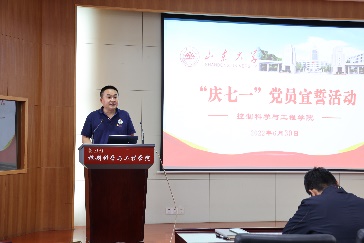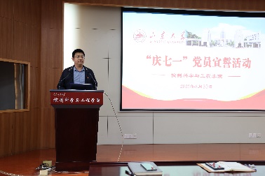 活动在雄壮的国歌声中拉开序幕,参加仪式的全体党员面对党旗,在领誓人孙之栋带领下,举起右手庄重宣誓,时刻提醒着自己所肩负的神圣使命和责任,为共产主义事业奋斗终生。宣誓完毕后,新党员代表孙晓辉,老党员代表范崇峰分别发言。孙晓辉表示,对党忠诚,是共产党人首要的政治品质,要用坚定的信念作支撑,用崇高的理想作牵引,作为学生党员,要不断增长见识,开拓视野,认真科研,政治上靠得住、学习上有佳绩。范崇峰表示,时刻牢记全心全意为人民服务的宗旨,具备坚定的信念和崇高的觉悟,发挥党员的先锋模范带头作用,把个人的人生追求同民族的前途命运紧紧联系在一起。