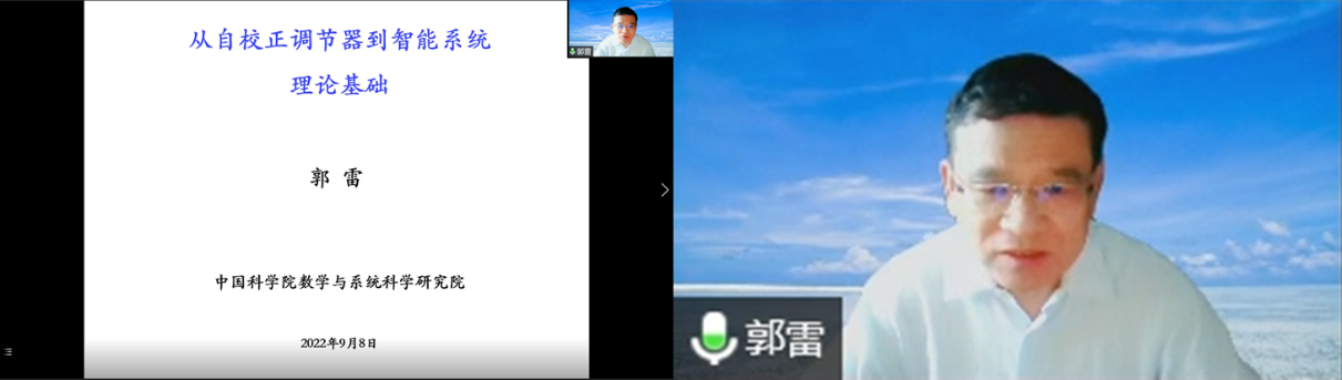 开幕式后,沙龙进入报告环节。郭雷院士作了题为“从自校正调节器到智能系统理论基础”的报告,通过自校正调节器理论的建立过程阐述了智能系统基本科学问题的相关理论、方法和启示, 并对未来研究方向给出了评述和展望。